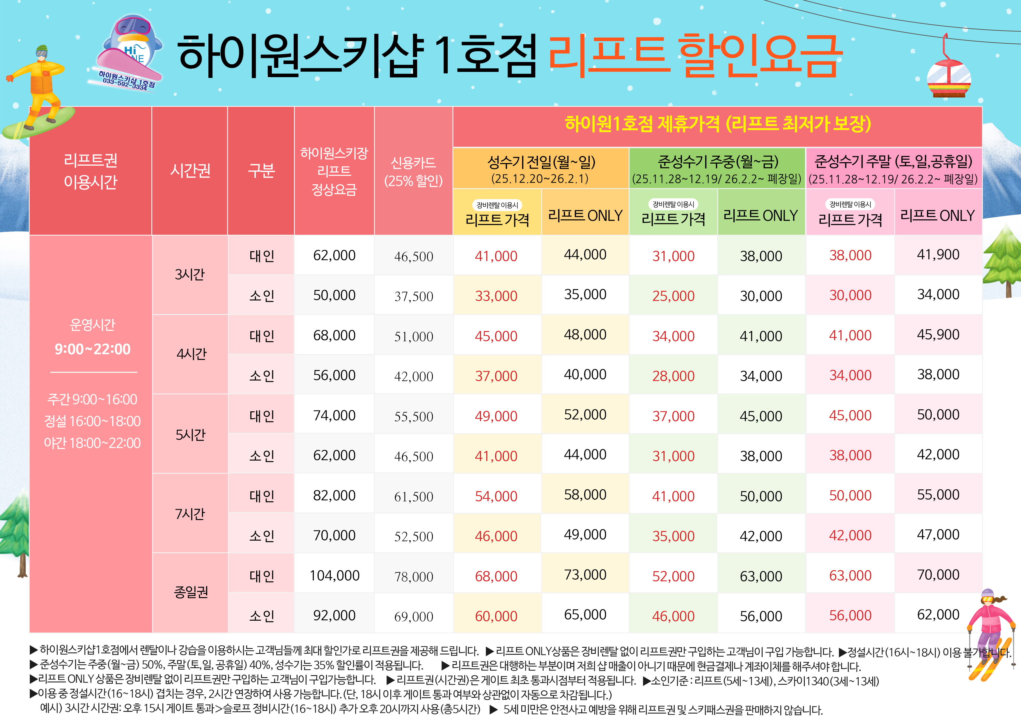 * 준성수기 : 개장일~ 12월 19일까지, 25년 2월 2일부터 폐장일