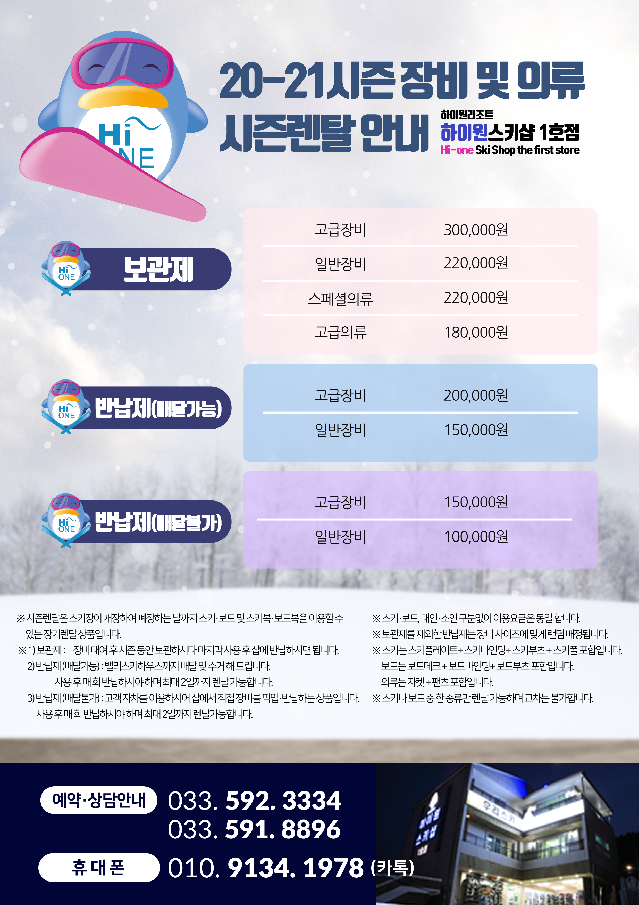 안녕하세요! 저희 하이원스키샵1호점에서는 이번 시즌 저렴한 가격에 장기렌탈을 할 수 있는 시즌렌탈 상품을 준비하였습니다.